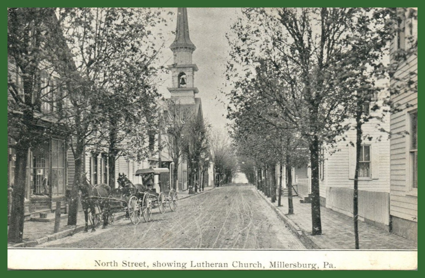 An undated picture post card view of North Street in Millersburg, Dauphin County, Pennsylvania, showing the Lutheran Church.