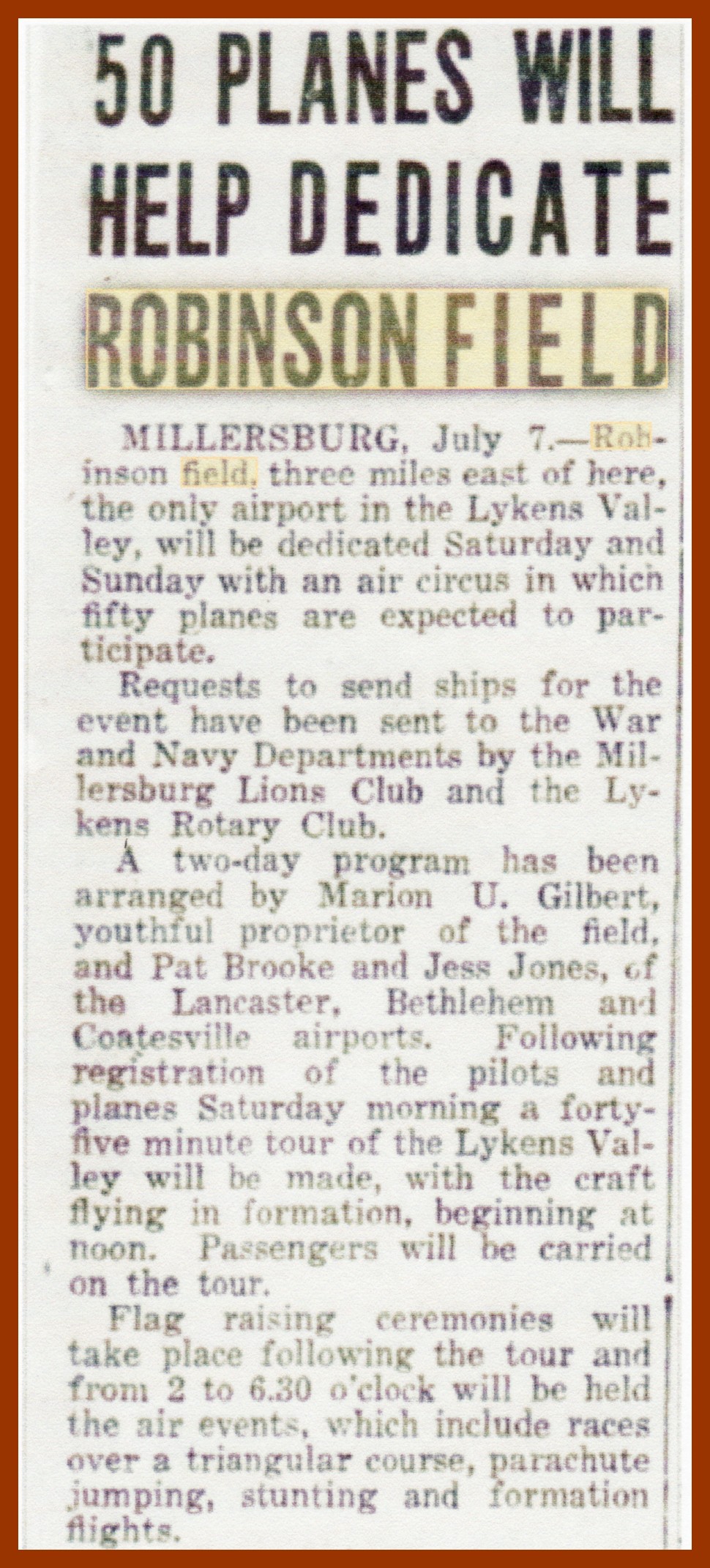 Millersburg, Juyl 7 [1930] – Robinson Field, three miles east of here, the only airport in the Lykens Valley, will be dedicated Saturday and Sunday with an air circus in which fifty planes are expected to participate.