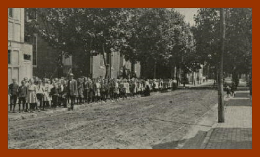 An undated photograph from an old post card said to be of pupils of the Centre Street School lined up outside the school, Millersburg, Dauphin County, Pennsylvania.