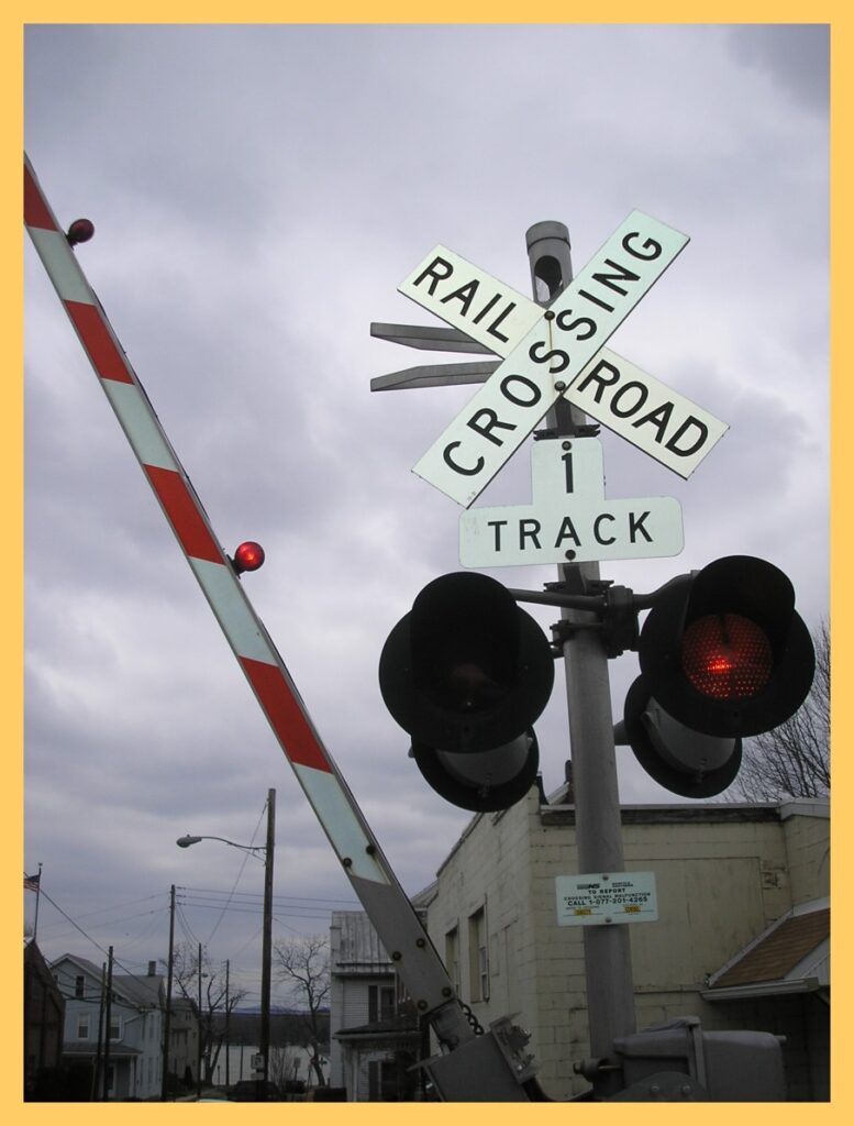 A photograph taken in 2011 of the crossing light and gate, looking west toward the Susquehanna River, at the Historic Millersburg Railroad Station, Millersburg, Dauphin County, Pennsylvania.
