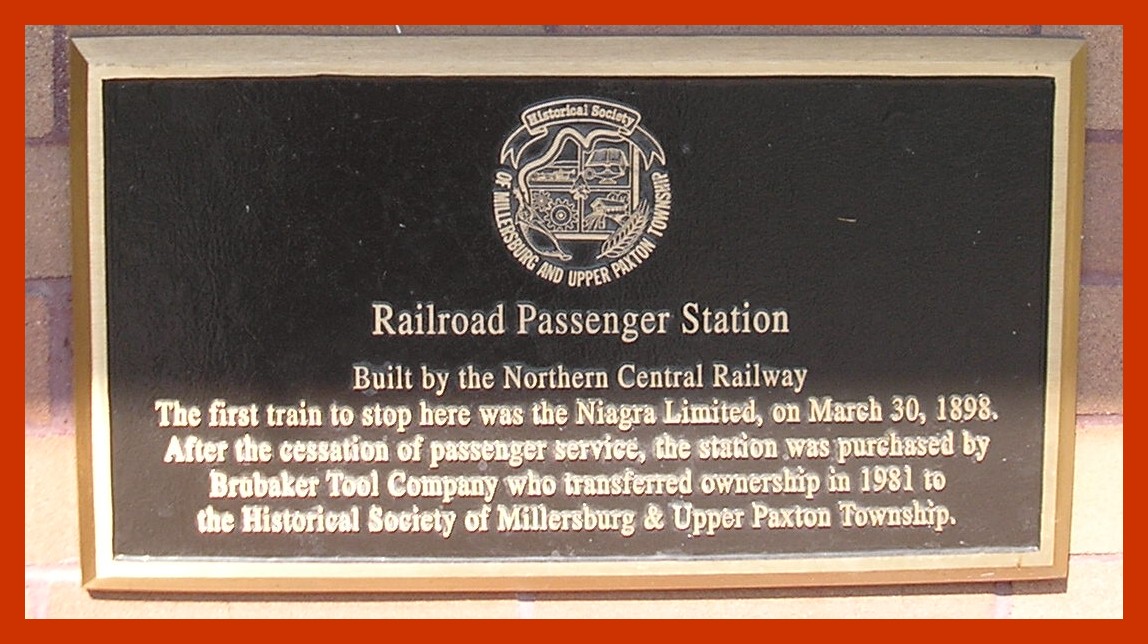 The first train to stop here was the Niagra [sic] Limited, on March 30, 1898. After the cessation of passenger service, the station was purchased by Brubaker Tool Company who transferred ownership in 1981 to the Historical Society of Millersburg & Upper Paxton Township.