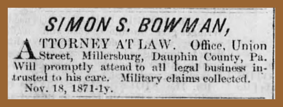 An advertisement from the Lykens Register, January 26, 1872, for Simon S. Bowman, Union Street, Millersburg, Dauphin County, Pennsylvania.