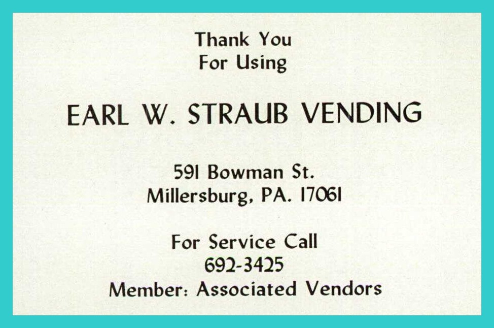 A 1982 advertisement for Earl W. Straub Vending, 591 Bowman Street, Millersburg, Dauphin County, Pennsylvania.