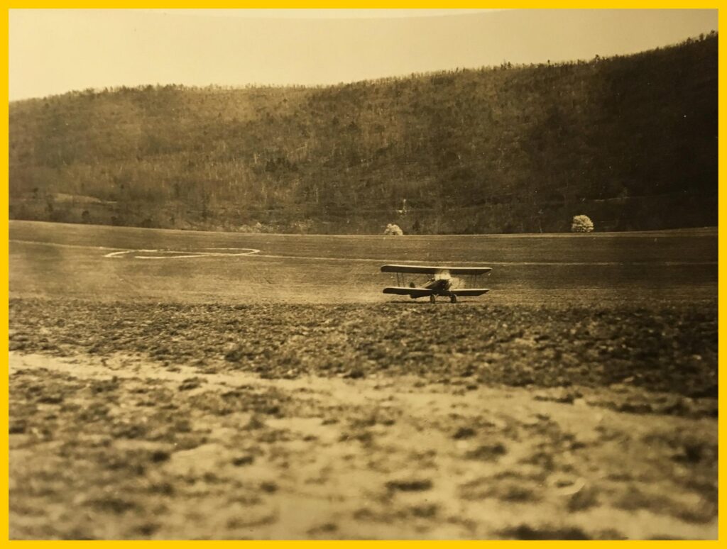 An undated photograph of a plane taking off from Robinson Field, the airport at Millersburg, Dauphin County, Pennsylvania.