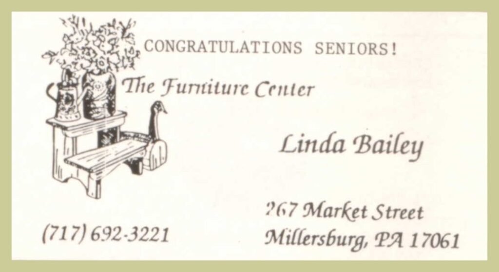 A 1990 advertisement (business card) for Linda Bailey, The Furniture Center, 267 Market Street, Millersburg, Dauphin County, Pennsylvania.