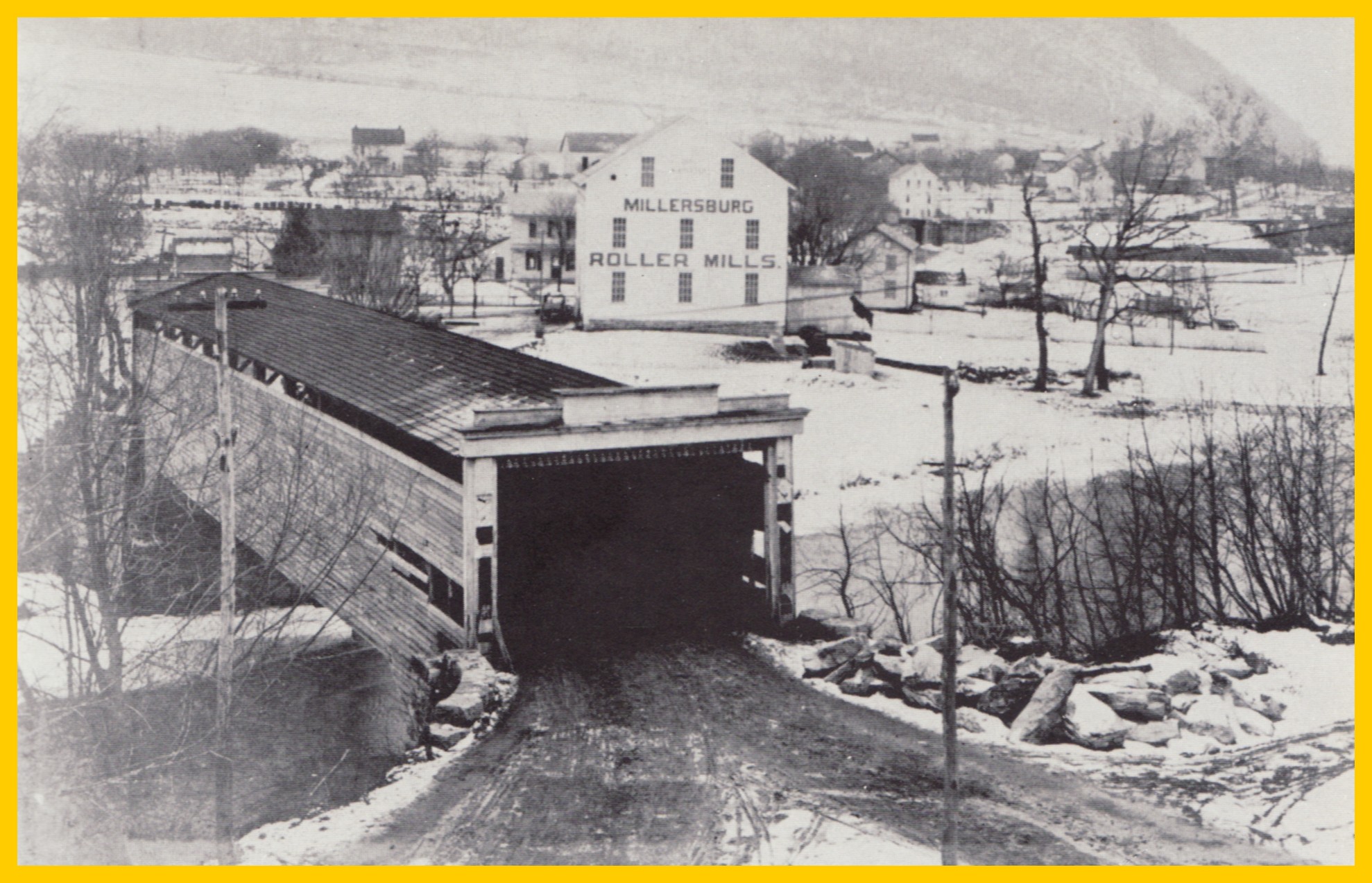 An 1895 winter view of the covered bridge over the Wiconisco Creek at the southern end of Market Street, Millersburg, Dauphin County, Pennsylvania. The Millersburg Roller Mills appears in the center of the photograph on the Millersburg side of the creek.