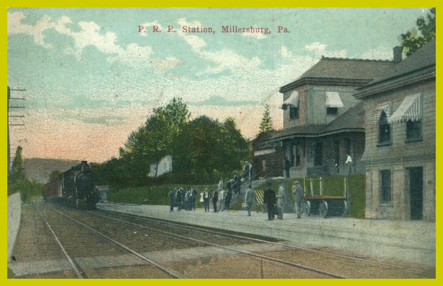 An undated colorized post card view of a Pennsylvania Railroad train from the north heading into the Millersburg Railroad Station, Millersburg, Dauphin County Pennsylvania. On the platform are passengers waiting to board.