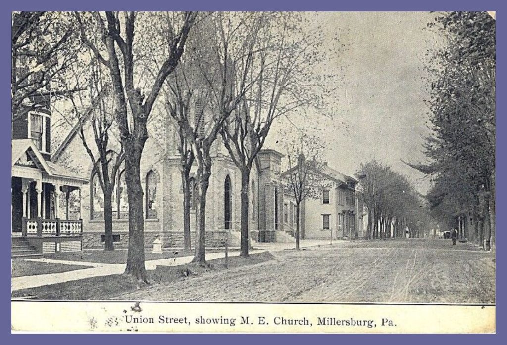 An undated photo post card view of Union Street in Millersburg, Dauphin County, Pennsylvania, showing the Methodist Episcopal Church.