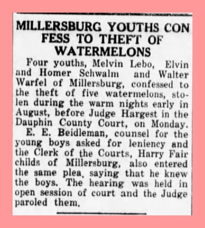 Four youths, Melvin Lebo, Elvin Schwalm, Homer Schwalm, and Walter Warfel of Millersburg, confessed to the theft of five watermelons, stolen during the warm nights early in August, before Judge Hargest in the Dauphin County Court, on Monday.
