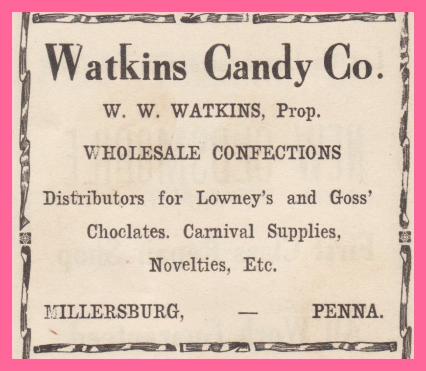 An advertisement for Watkins Candy Company, Millersburg, Dauphin County, Pennsylvania.