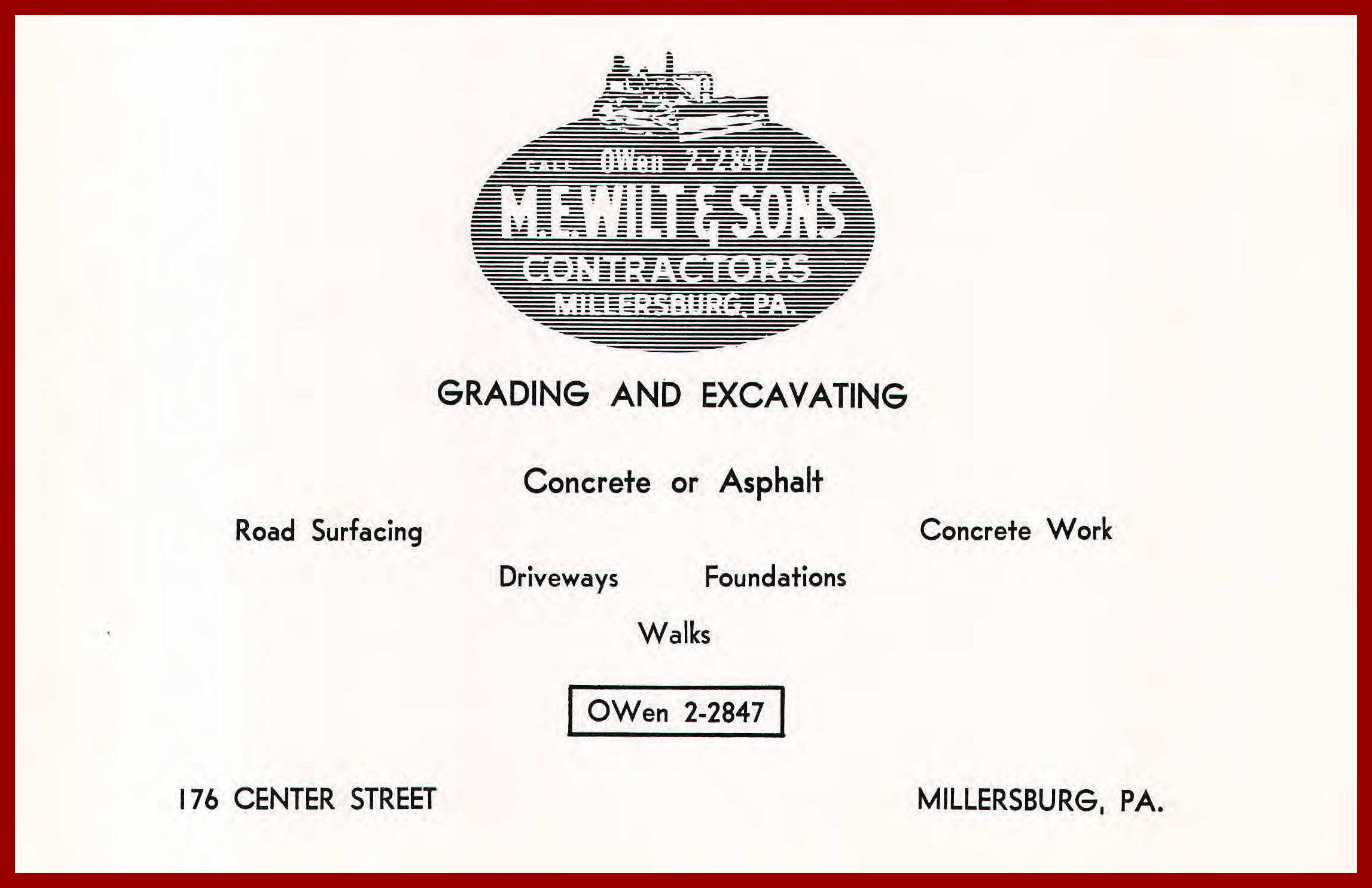 A advertisement for M. E. Wilt and Sons Contractors, 176 Center Street, Millersburg, Dauphin County, Pennsylvania.
