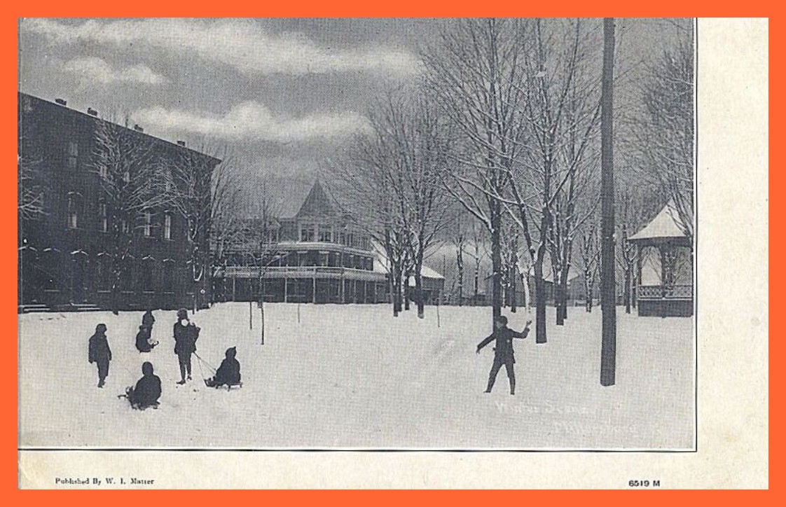 An undated picture post card winter view of children playing in the snow in the public square, Millersburg, Dauphin County, Pennsylvania.