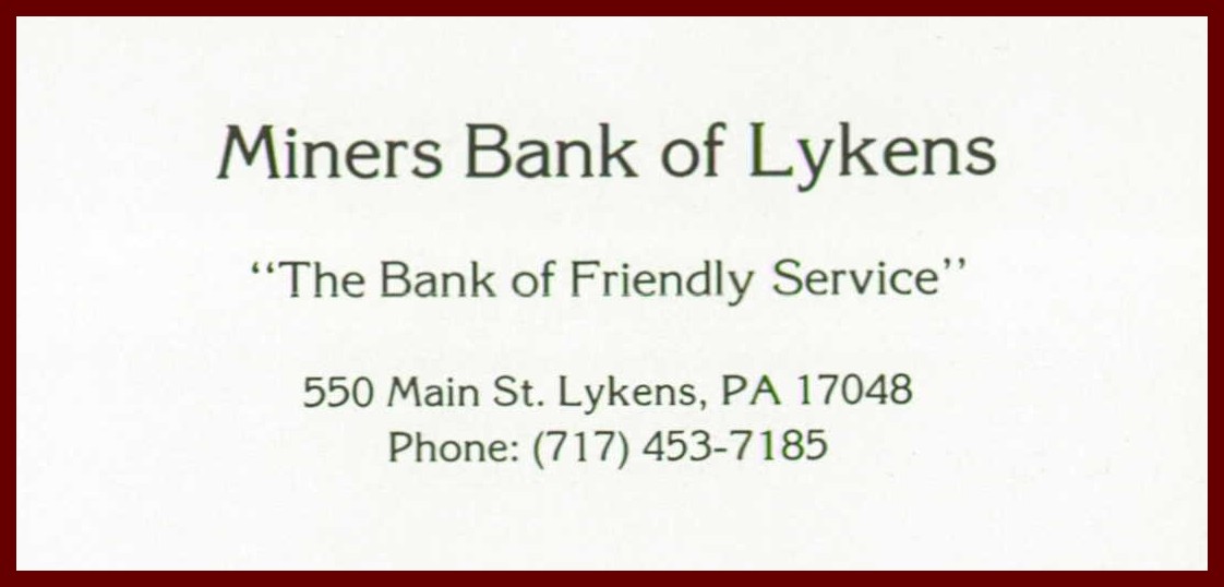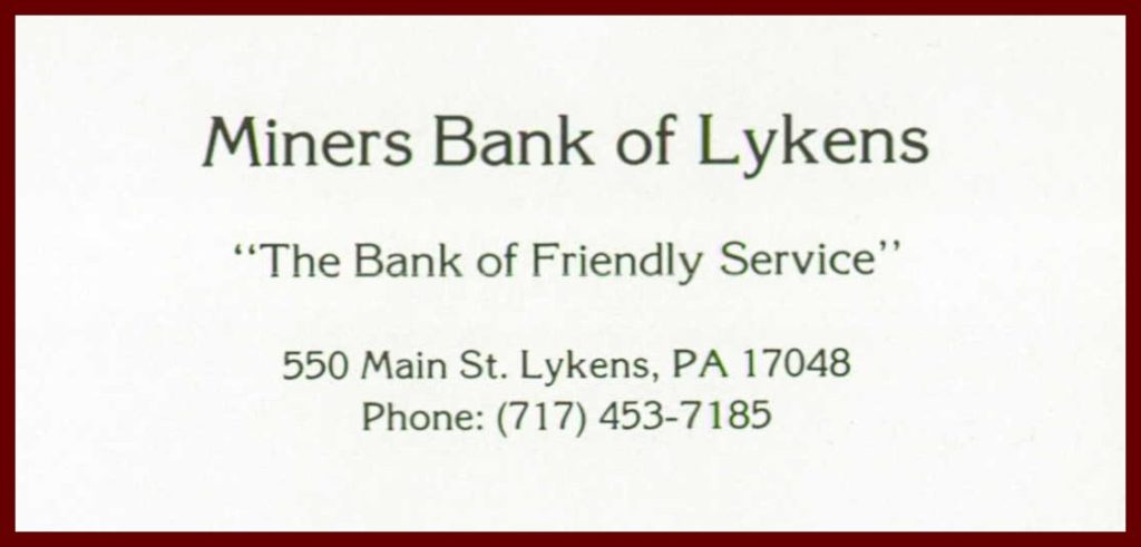 A 1987 advertisement for Miners Bank of Lykens, 550 Main Street, Lykens, Dauphin County, Pennsylvania.