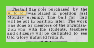 The tall flag pole purchased by the K. K. K. was placed in position last Monday evening. The ball for flag will be put in position later. The work was done by members of the organization, who, with the students, teachers and citizenry will be delighted to see Old Glory unfurled from it.