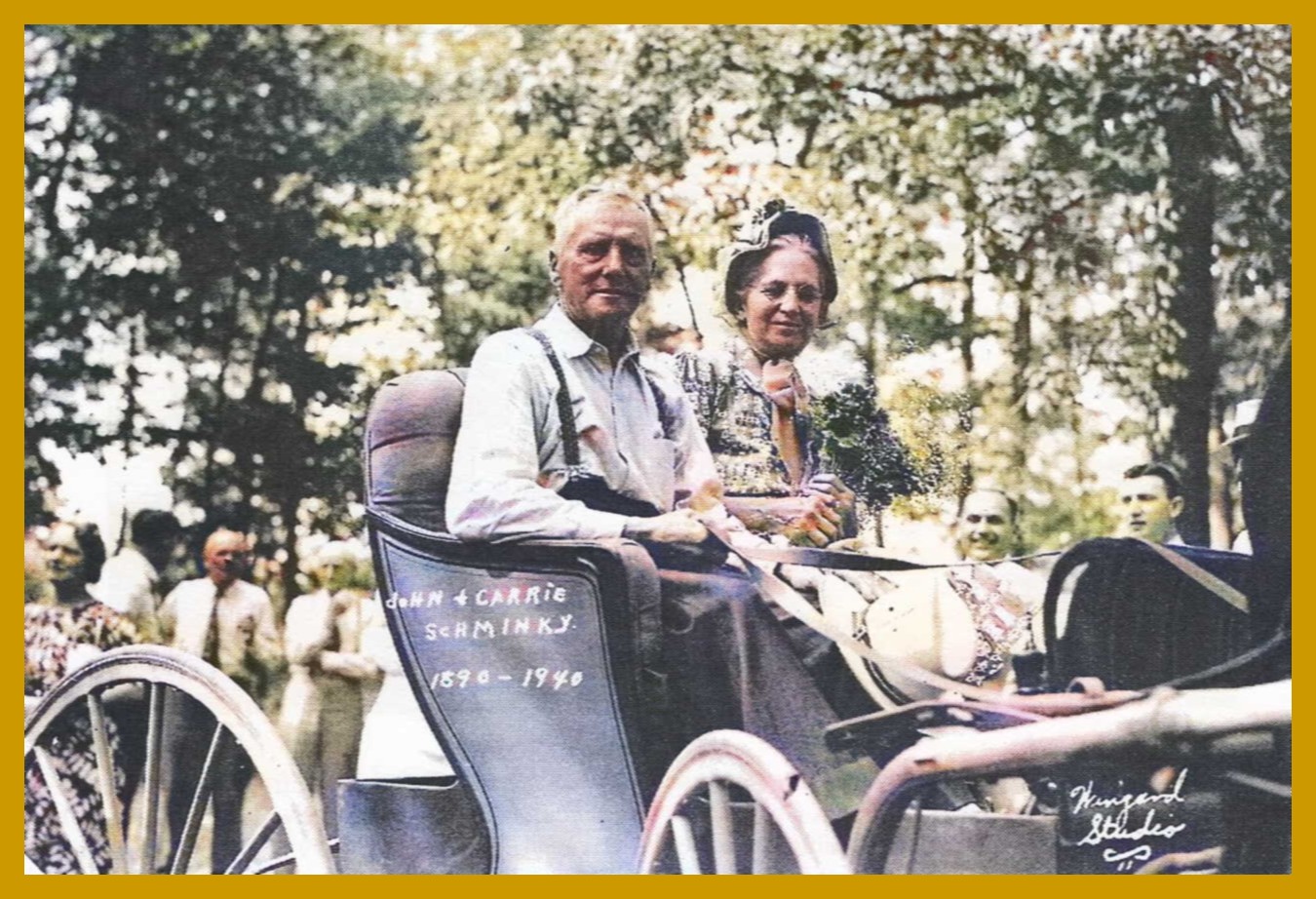 A (colorized) photograph of John Finley Morse Schminky (1872-1960) and Carrie Louisa [Maurer] Schminky (1874-1962) on the occasion of their 50th Wedding Anniversary in 1940. The couple lived in Gratz, Dauphin County, Pennsylvania.