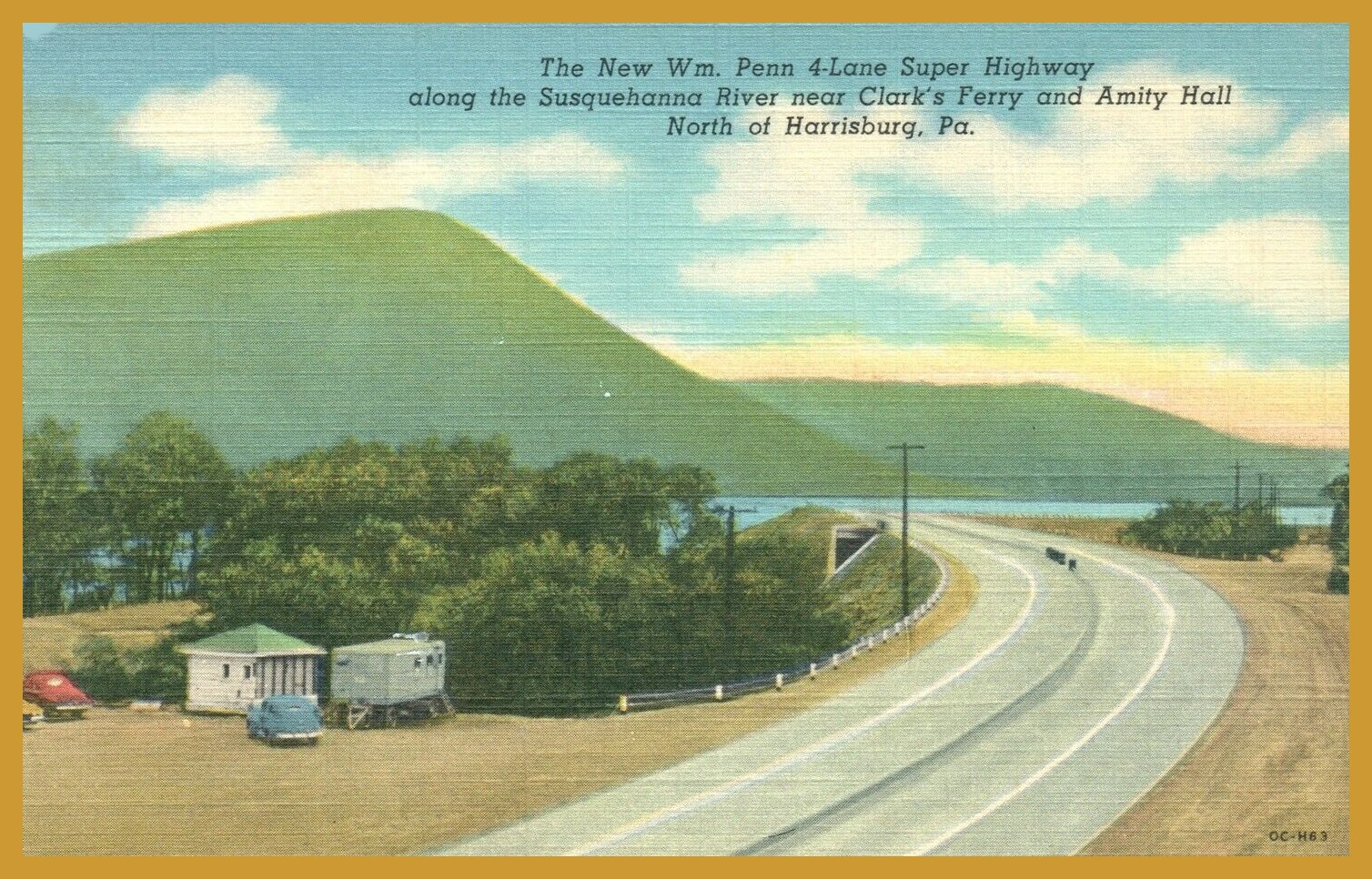 An undated colorized post card view of the new super 4-lane highway along the Susquehanna River north of Harrisburg, near Clark’s Ferry and Amity Hall.