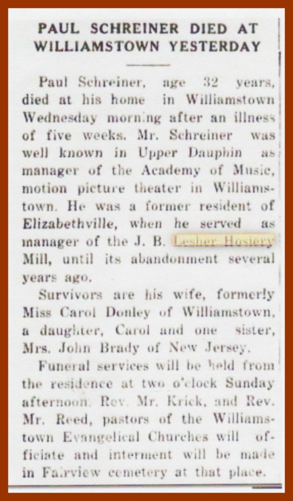 Paul Schreiner, age 32 years, died at his home in Williamstown Wednesday morning after an illness of five weeks. Mr. Schreiner was well known in Upper Dauphin as manager of the Academy of Music, motion picture theater in Williamstown. He was a former resident of Elizabethville, when he served as manager of the J. B. Lesher Hosiery Mill [Unrivaled Hosiery Mill], until its abandonment several years ago.