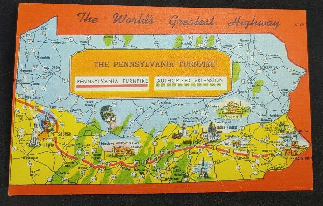 An undated post card map showing the Pennsylvania Turnpike and the land area of Pennsylvania is passes through, including the Harrisburg area. Route 209 is shown as it passes through the Lykens Valley, but none of the towns are noted. A breaker is representative of anthracite coal mining.
