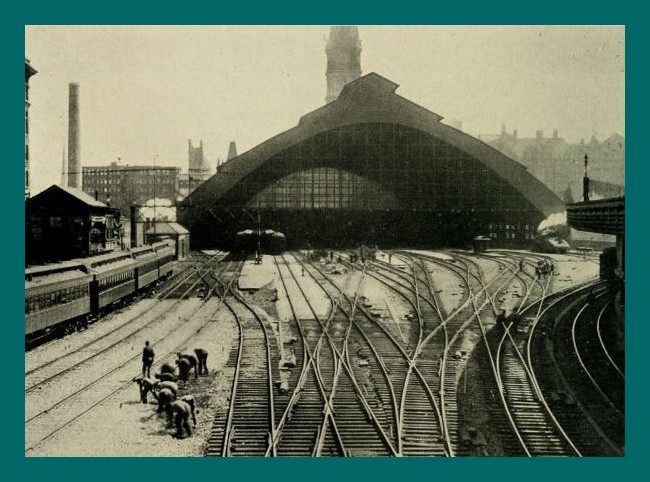 A photograph from before 1911 of the Pennsylvania Railroad’s Broad Street Station, across from City Hall, Philadelphia, Pennsylvania. The view is looking east into the train shed. The City Hall tower can be seen behind the station.