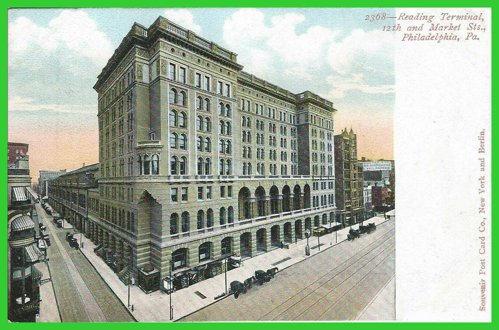 An undated colorized post card view of the Philadelphia and Reading Railroad Terminal Building, 12th and Market Streets, in Philadelphia, Pennsylvania.