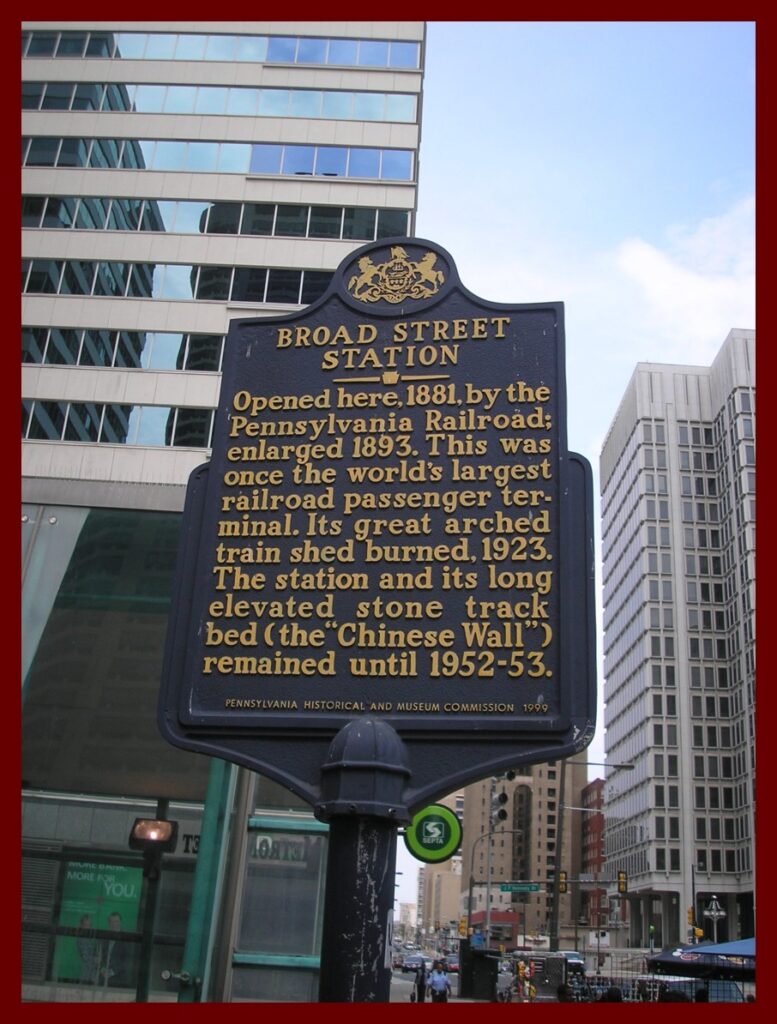 A photograph taken in 2011 of the historical marker at the location of the Pennsylvania Railroad’s Broad Street Station in Philadelphia. This was the railroad’s main station in Philadelphia and the terminal for passengers who traveled from the Lykens Valley area to the business center of the state’s largest city.