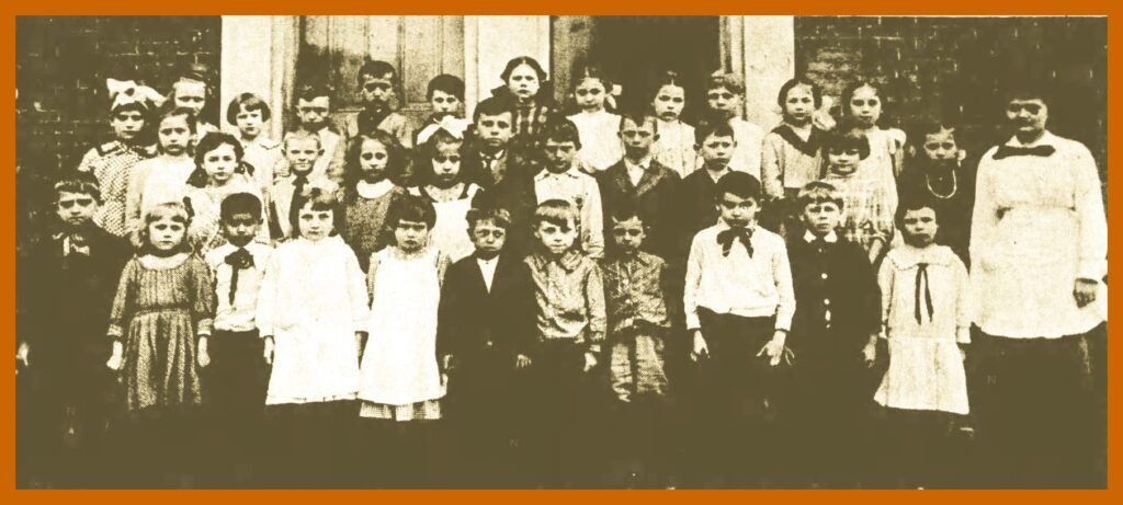 A 1912 or 1913 photograph of the second grade class of the Mill Street School, Pine Grove, Schuylkill County, Pennsylvania. The teacher, standing at right is Miss Iva Honsberger, later Mrs. Jacob Bittle.