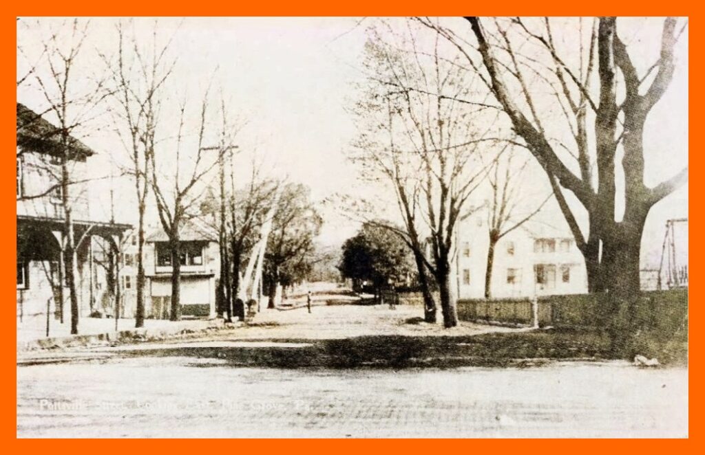 A colorized newspaper photograph of an undated post card view of Pottsville Street, looking east from Tulpehocken Street, Pine Grove, Schuylkill County, Pennsylvania. Note the railroad structure and gates at the location of the tracks.