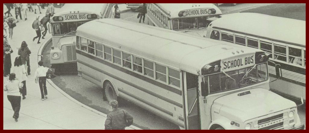 A 1973 photograph of school buses outside the Pine Grove High School, Pine Grove, Schuylkill County, Pennsylvania.