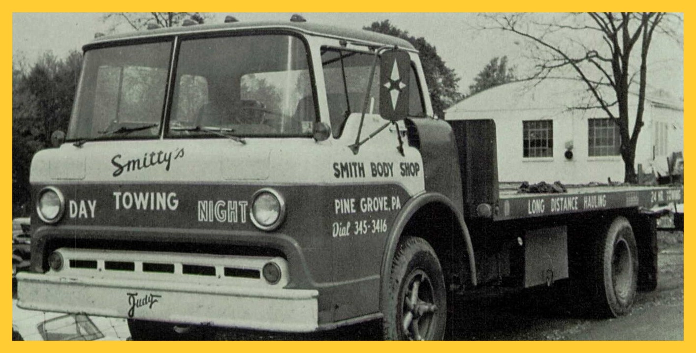 A 1972 advertising photograph for Smith Body Shop, also known as “Smitty’s,” 13 Locust Street, Pine Grove, Schuylkill County, Pennsylvania.