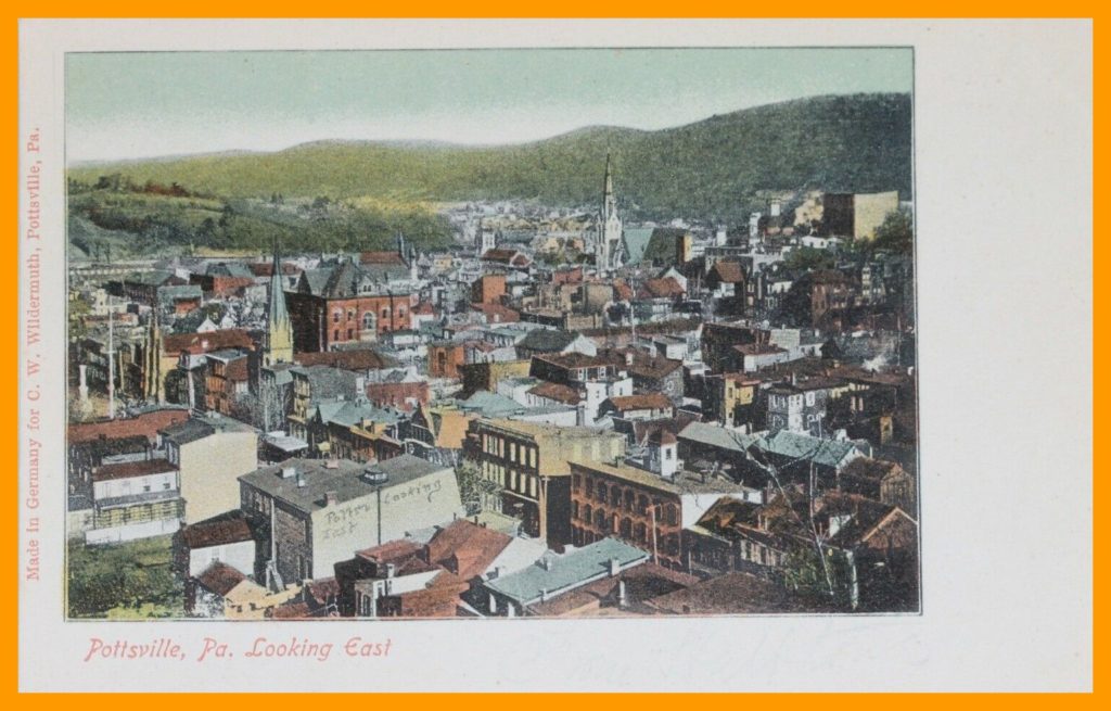 An undated colorized birds-eye view of Pottsville, looking East, Schuylkill County, Pennsylvania.