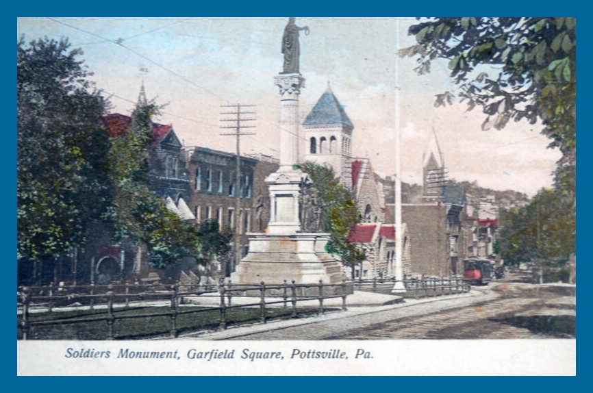 An undated colorized post card view of the Soldiers Monument and Garfield Square, Pottsville, Schuylkill County, Pennsylvania.