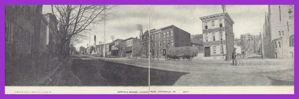 An undated double post card view of Garfield Square, looking west, Pottsville, Schuylkill County, Pennsylvania.