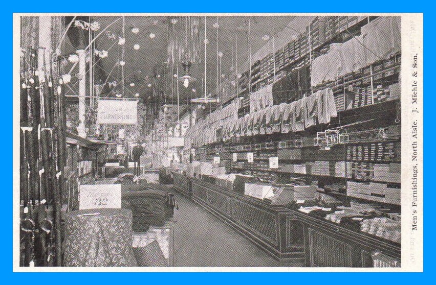An undated photo post card view of the interior of the J. Miehle and Sons Department Store, Pottsville, Schuylkill County, Pennsylvania. This card pictures the North Aisle, Men’s Furnishings.