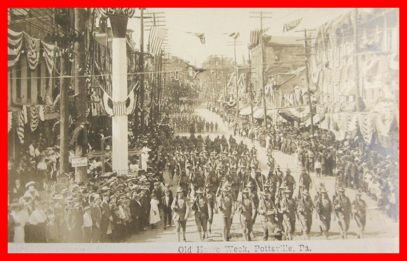An undated photo post card view of a parade for Old Home Week, Pottsville, Schuylkill County, Pennsylvania. This image shows soldiers marching in the parade and the buildings dressed in patriotic bunting.