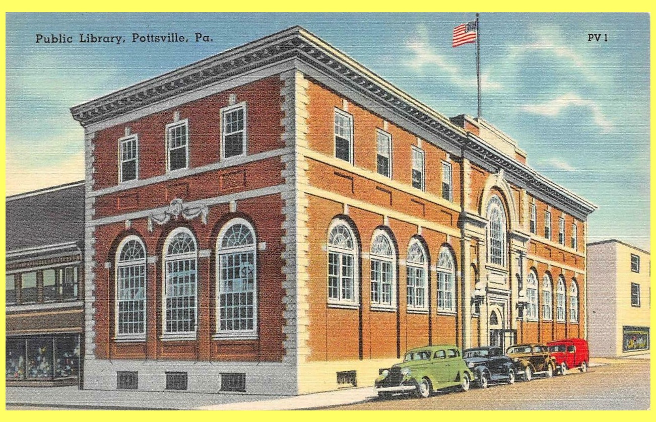 An undated colorized post card view of the Public Library, Pottsville, Schuylkill County, Pennsylvania.