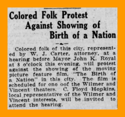 Colored folk of this city, represented by W. J. Carter, attorney, at a hearing before Mayor John K. Royal at 8 o’clock this evening, will protest against the showing of the moving picture feature film, The Birth of a Nation in this city. The film is scheduled for one of the Wilmer and Vincent theatres. C. Floyd Hopkins, local representative of the Wilmer and Vincent interests, will be invited to attend the hearing.