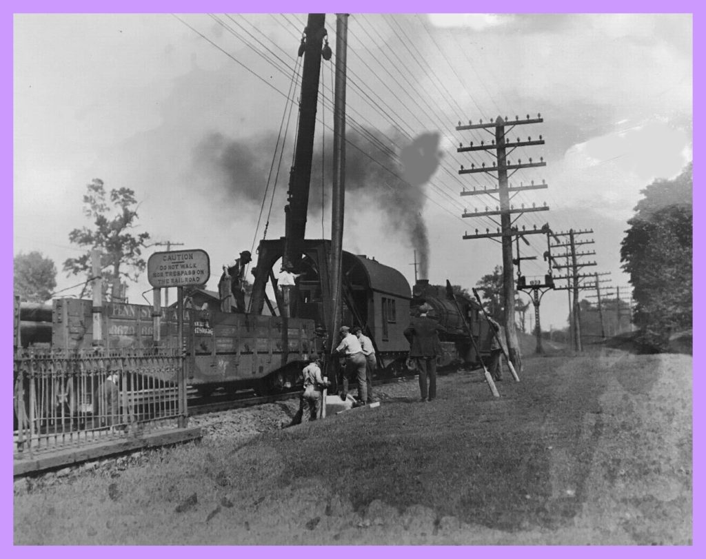 An undated photograph of a work crew near the Pennsylvania Railroad Station at Radnor, Delaware County, Pennsylvania.