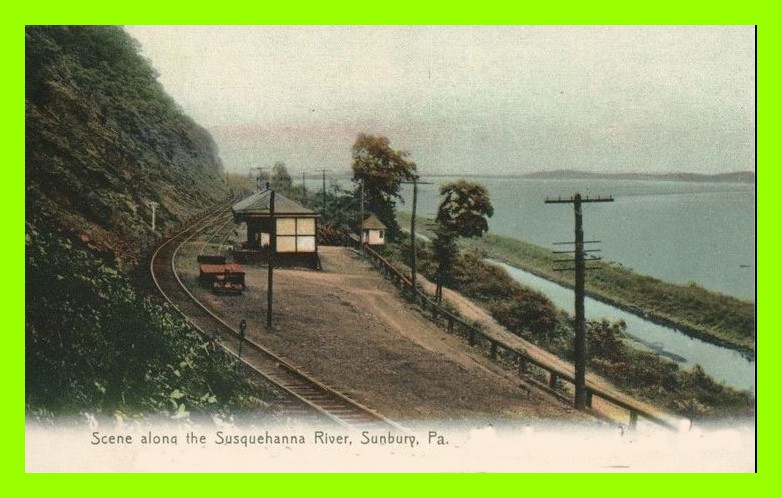 An undated colorized photo post card view of railroad tracks along the Susquehanna River, near Sunbury, Northumberland County, Pennsylvania. The railroad station in the picture is not identified.