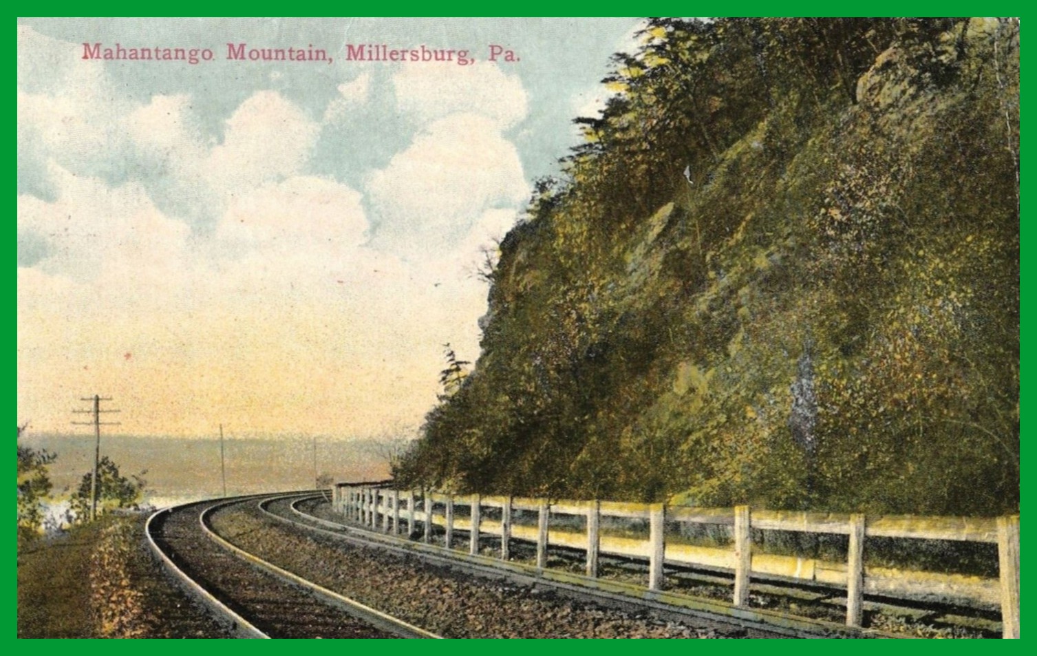 An undated colorized photo post card view of the railroad tracks going around the Mahantongo Mountain, north of Millersburg, Dauphin County, Pennsylvania.