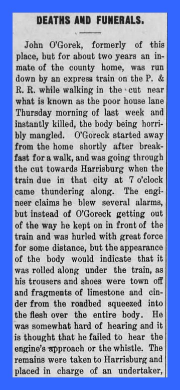 John O’Goreck, formerly of this place [Lykens], but for about two years an inmate of the county home, was run down by an express train on the P. & R. R. while walking in the cut near what is known as the poor house late Thursday morning of last week and instantly killed, the body being horribly mangled. O’Goreck started away from the home shortly after breakfast for a walk, and was going through the cut towards Harrisburg when the train due in that city at 7 o’clock came thundering along. The engineer claims he blew several alarms, but instead of O’Goreck getting out of the war he kept on in front of the train and was hurled with great force for some distance, but the appearance of the body would indicate that it was rolled along under the train, as his trousers and shoes were torn off and fragments of limestone and cinder from the roadbed squeezed into the flesh over the entire body. He was somewhat hard of hearing and it is thought that he failed to hear the engine’s approach or the whistle. The remains were taken to Harrisburg and placed in charge of an undertaker, and his children at this place [Lykens] notified. His son Joseph O’Goreck, went to that city [Harrisburg] to claim the body and returned with it in the evening, when it was taken to his residence on South Second Street. The funeral was held on Saturday morning, services being conducted in St. Mary’s church by Rev. Charles J. Galligan, after which the remains were laid to rest in the German Catholic Cemetery, The pall-bearers were Lewis Hoffman, Paul O‘Melia, Ambrose Bopp, Albert J. Fritz, Anthony Fritz, Anthony Fisher and Elijah Page.