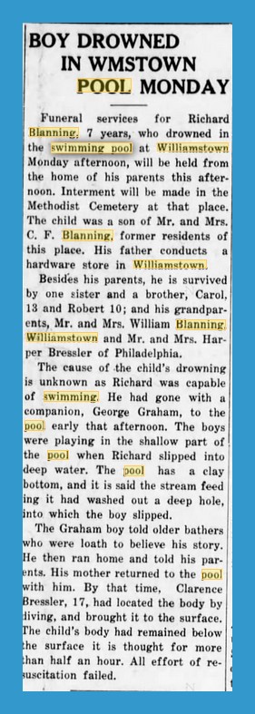 Funeral services for Richard Blanning, 7 years, who drowned in the swimming pool at Williamstown Monday afternoon, will be held from the home of his parents this afternoon. Interment will be made in the Methodist Cemetery at that place. The child was a son of Mr. and Mrs. C. F. Blanning, former residents of this place [Elizabethville]. His father conducts a hardware store in Williamstown.