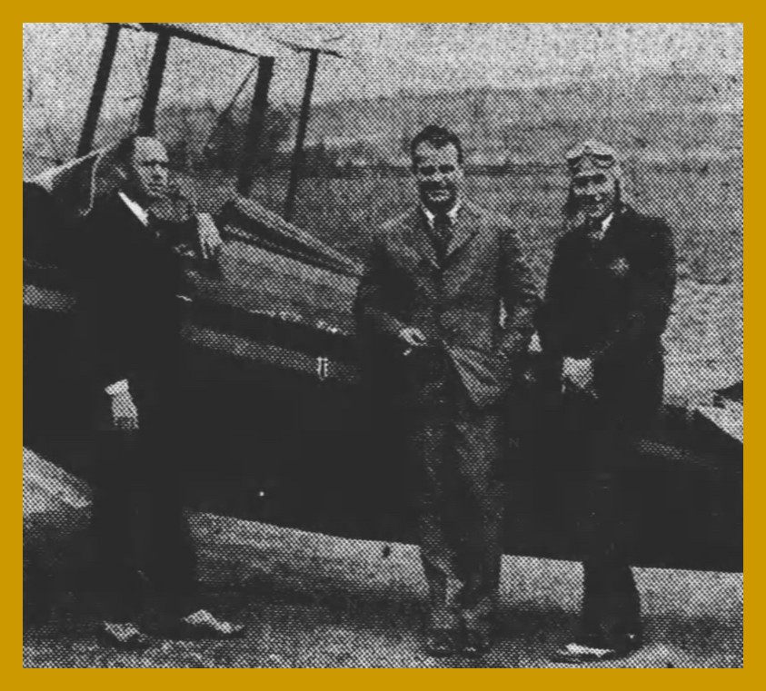 A July 12, 1936, newspaper photograph of three aviators from the Altoona-Tyron Aircraft Corporation who participated in the dedication of Robinson Field, Millersburg, Dauphin County, Pennsylvania.