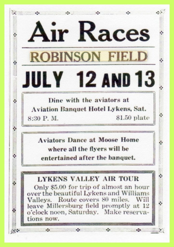 Only $5.00 for trip of almost an hour over the beautiful Lykens and Williams Valleys. Route covers 80 miles. Will leave Millersburg field promptly at 12 o’clock noon, Saturday. Make reservations now.