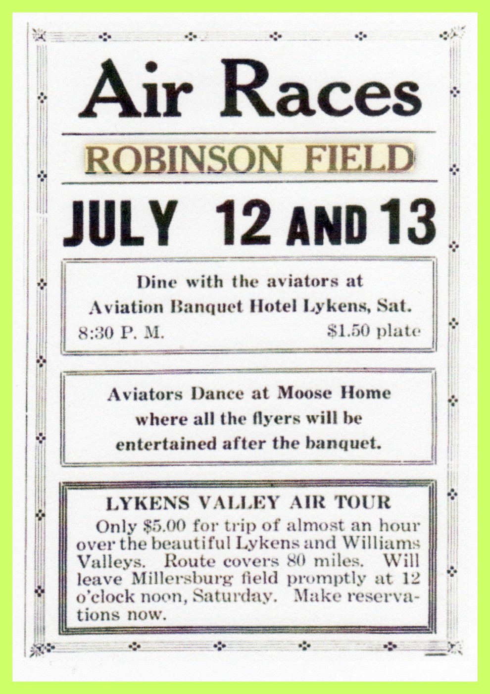 A 1930 advertisement for the Air Races and dedication of Robinson Field, Millersburg, Dauphin County, Pennsylvania. The ad appeared in the West Schuylkill Herald, 11 July 1930.