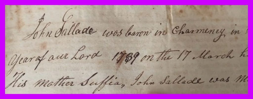 There is no indication as to the person who made the entries in the Bible, but if this is conclusively determined to be the Bible belonging to Simon Sallada, it would be considered a legal document that timely recorded the actual names of family persons and their dates of birth, baptism, marriage, and dates. At the present time there is no reason to conclude that the Bible did not belong to Simon Sallada, but because its discovery was so far removed from the recorded events, it would be prudent to have each entered fact checked against other known sources.