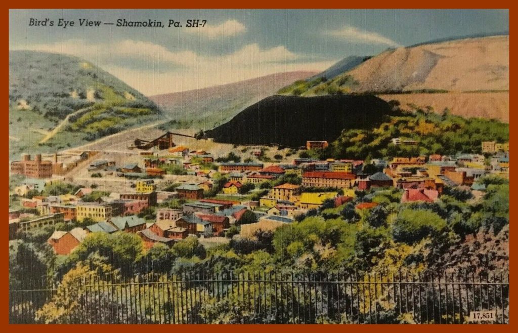 An undated colorized birds-eye post card view of Shamokin, Northumberland County, Pennsylvania.