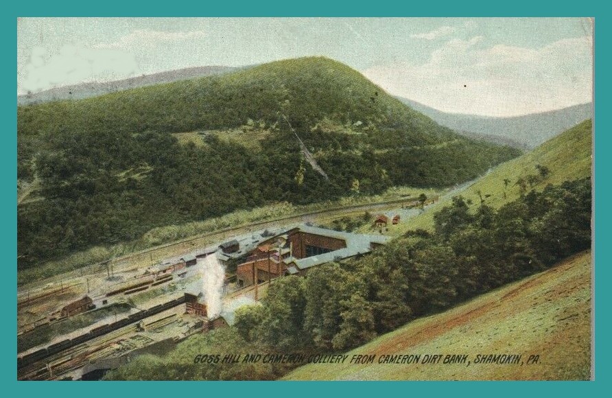 An undated colorized post card view of the Cameron Colliery and Goss Hill from the Cameron Dirt Bank, Shamokin, Northumberland County, Pennsylvania