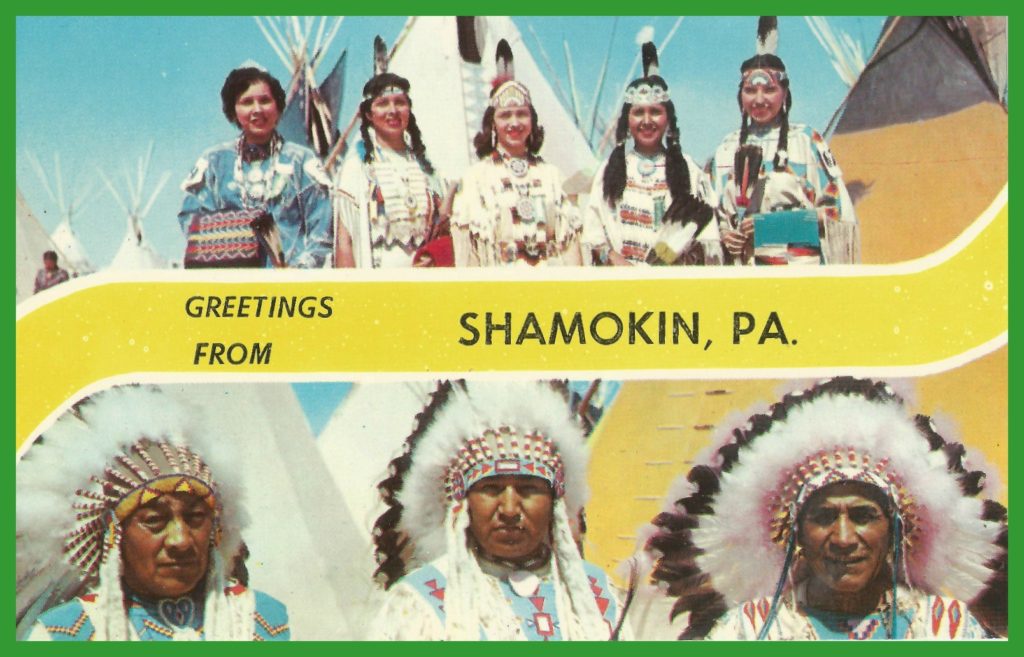 An undated generic color photo post card view published for Shamokin, Northumberland County, Pennsylvania. The card features a photo (at top) of Native American women in traditional dress and a photo (at bottom) of Native America men in traditional dress. It is not stated where the photos were taken nor is it stated whether the traditional dress is representative of the tribes that inhabited the Central Susquehanna Valley.