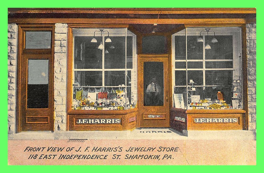 An undated colorized post card view of the front of J. F. Harris‘s Jewelry Store, 118 East Independence Street, Shamokin, Northumberland County, Pennsylvania.