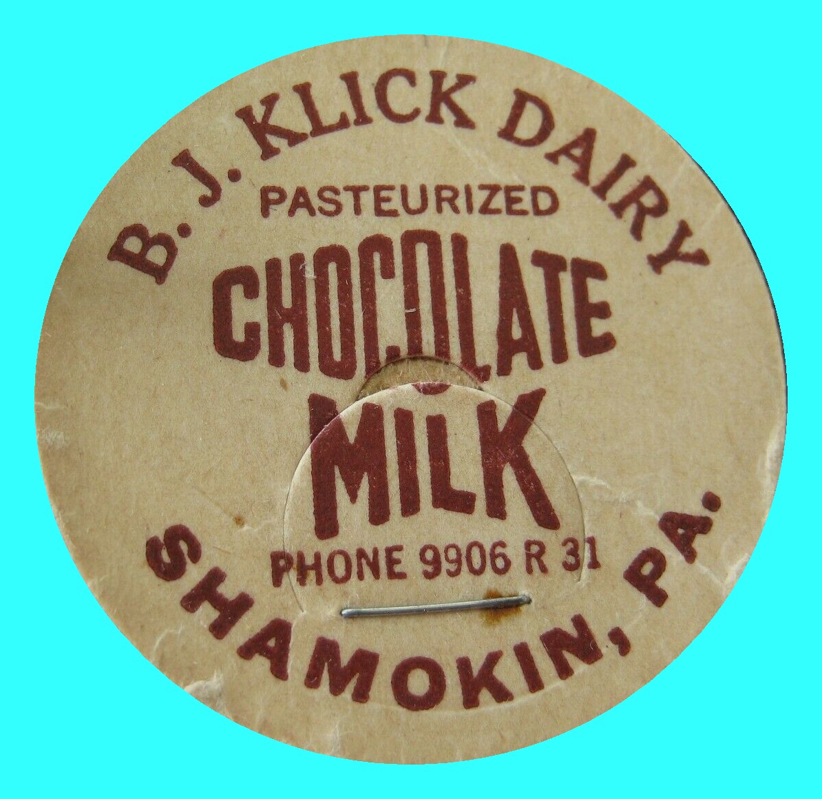 An undated cardboard bottle top for Pasteurized chocolate milk from B. J. Klick Dairy, Shamokin, Northumberland County, Pennsylvania.